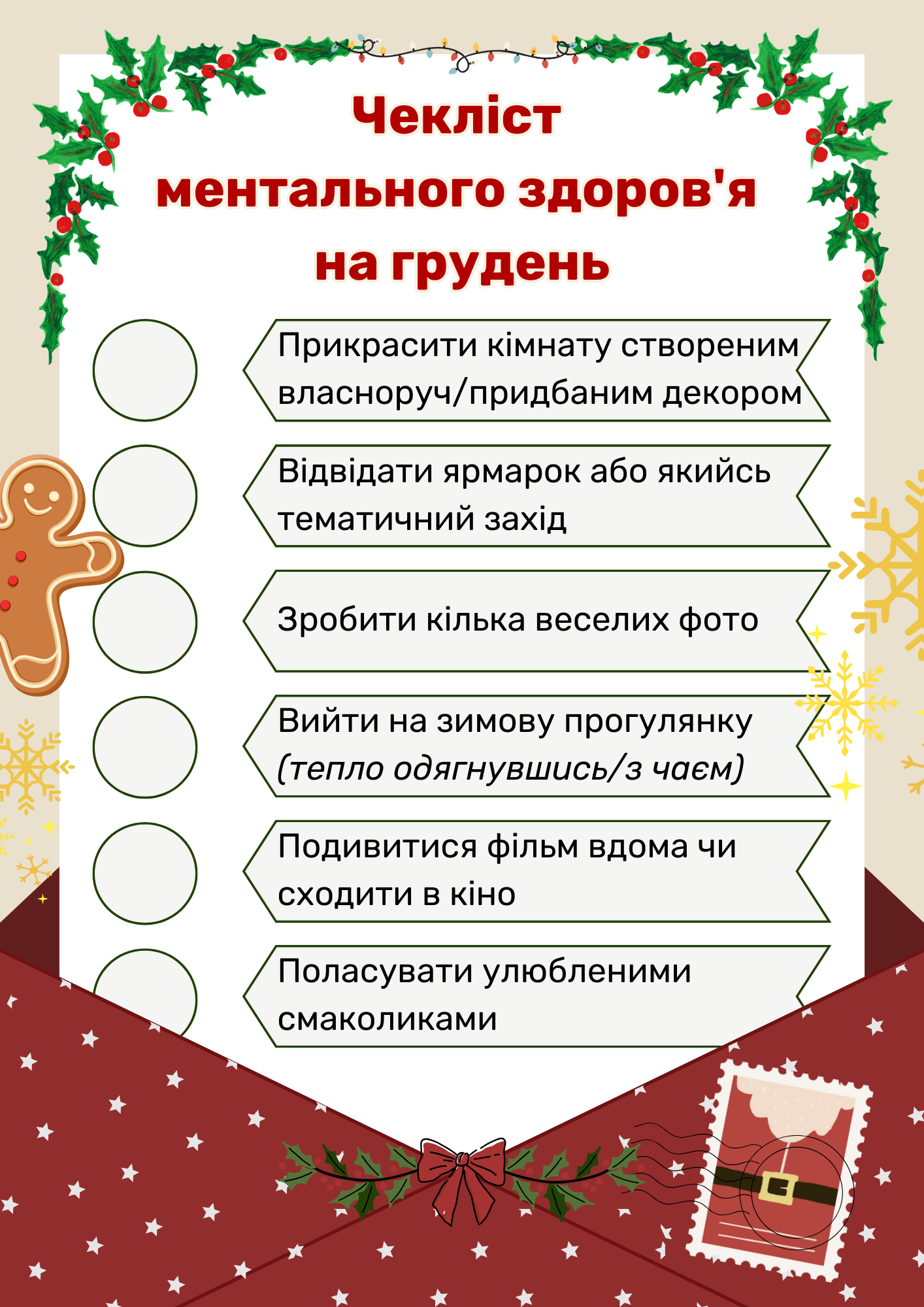 🎄 Ось і добігає кінця 2025-й рік, який для когось став одним із найкращих, а для декого – найважчим. Попереду ще один місяць ялинок, мандаринок і шансів покращити свій ментальний стан, а допомогти в цьому може новий чекліст ментального здоров’я на грудень.